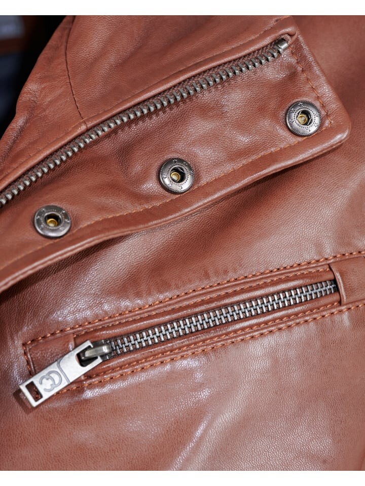 Кожаная куртка из бархатистой мягкой кожи от качественного бренда JCC. Прочная кожаная куртка впечатляет высококачественной кожей наппа ягненка в сочетании с высоким уровнем комфорта. В передней части куртка оснащена двумя нагрудными карманами, двумя боковыми карманами и карманами с клапанами. Внутри два кармана на молнии и карман на окантовке.