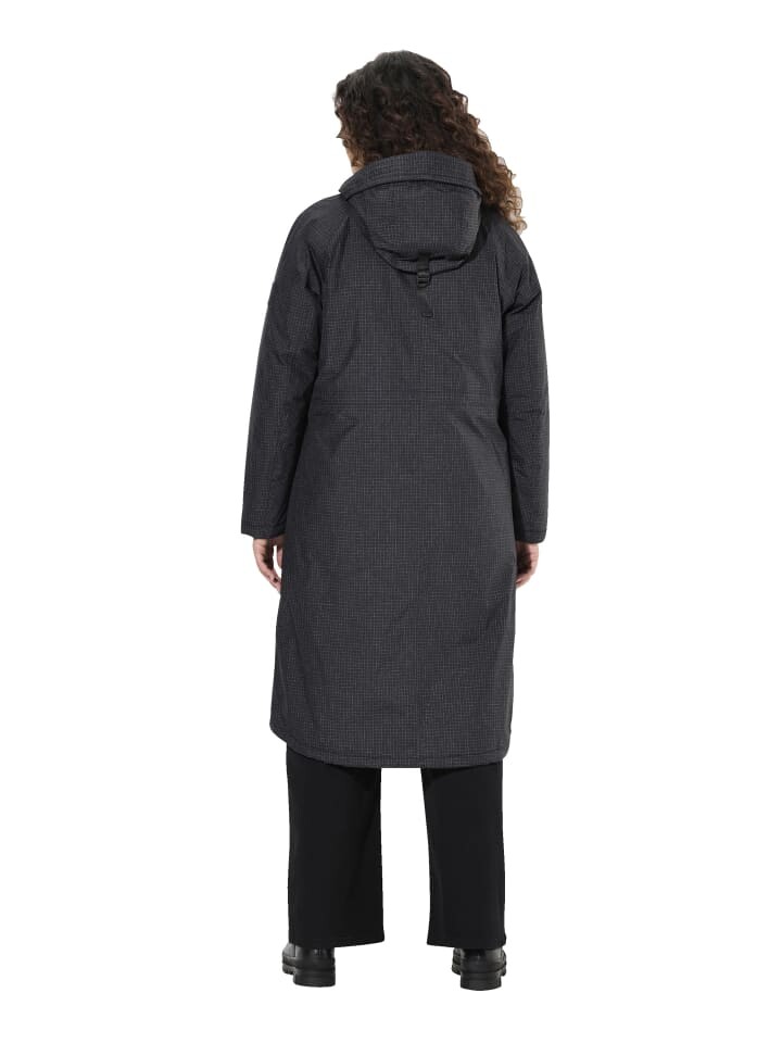 Функциональное пальто с клетчатым узором. Водонепроницаемый (10 000 мм водного столба), ветронепроницаемый, дышащий (5 000 г/кв.м/24 часа). Дополнительная отделка DWR без содержания фтора. Подчеркнуто красным: тесьма на капюшоне и подоле, потайная двусторонняя молния. 2 прорезных кармана, 2 водонепроницаемых кармана на молнии. Длинные рукава с ветрозащитой. Подкладка и наполнитель из переработанного полиэстера GRS, сертифицированного Ecocert Greenlife, 152026