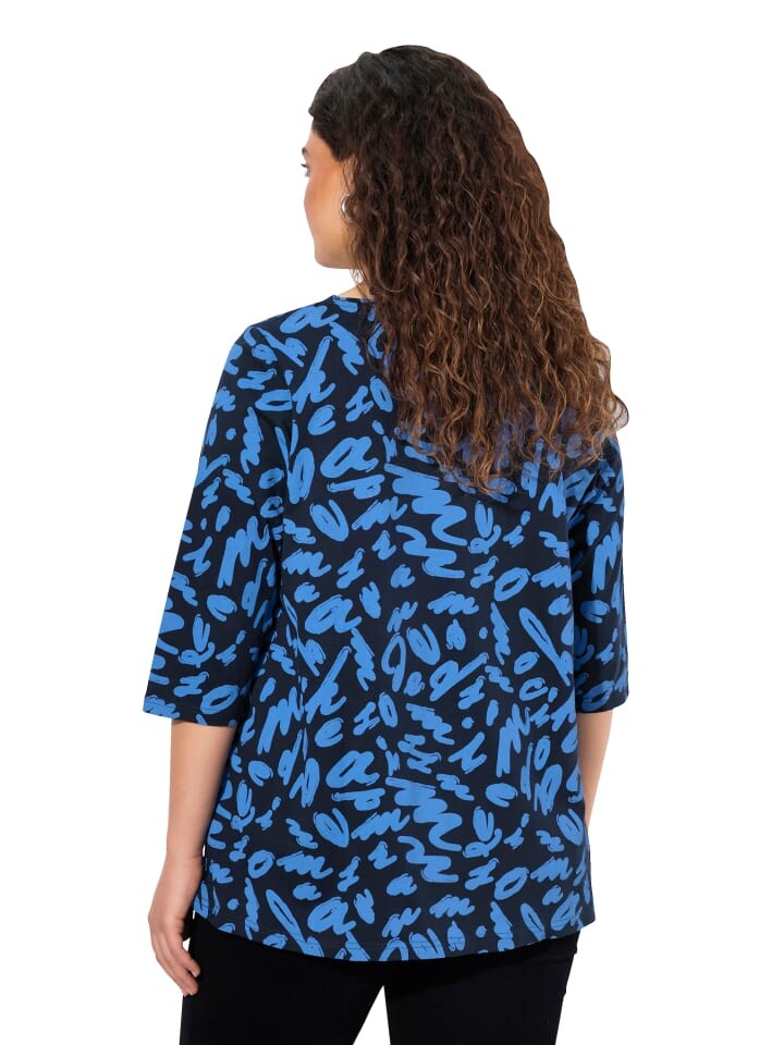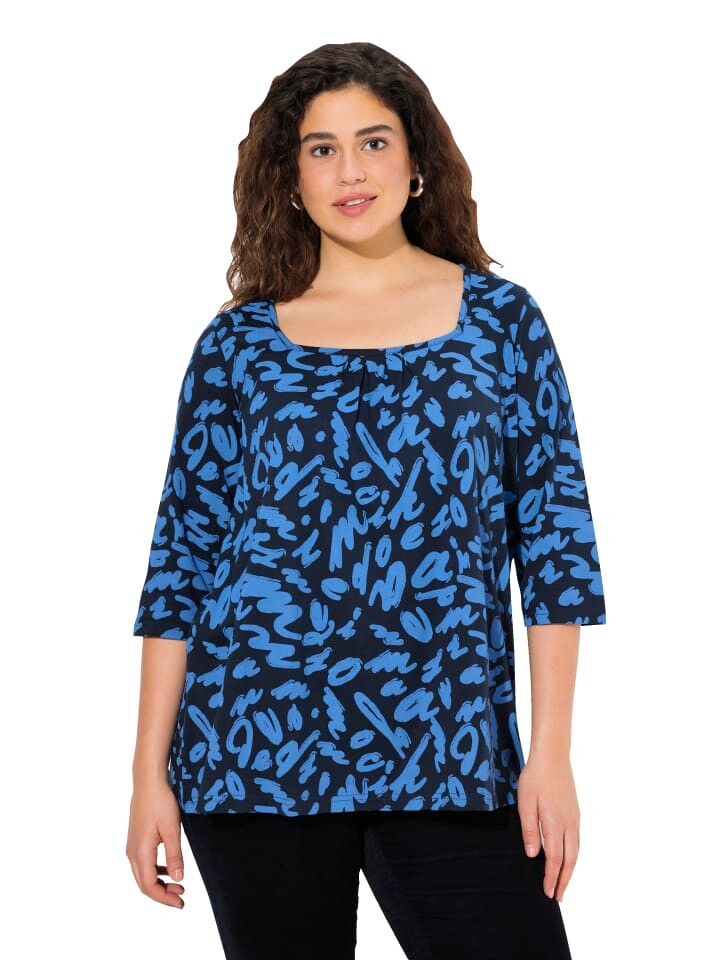Футболка А-силуэта с минимальным рисунком. Квадратный вырез с декоративными складками, рукава 3/4. Внешний материал: 100% хлопок.