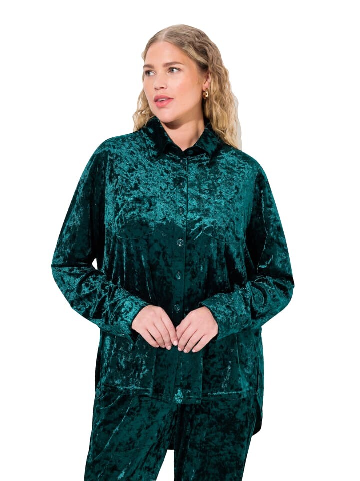 Бархатная блузка А-силуэта из мятого структурированного бархата. Воротник рубашки, планка на пуговицах, 2 нагрудных кармана. Длинные рукава с манжетами, закругленный низ с разрезами по бокам - еще больше свободы движений.