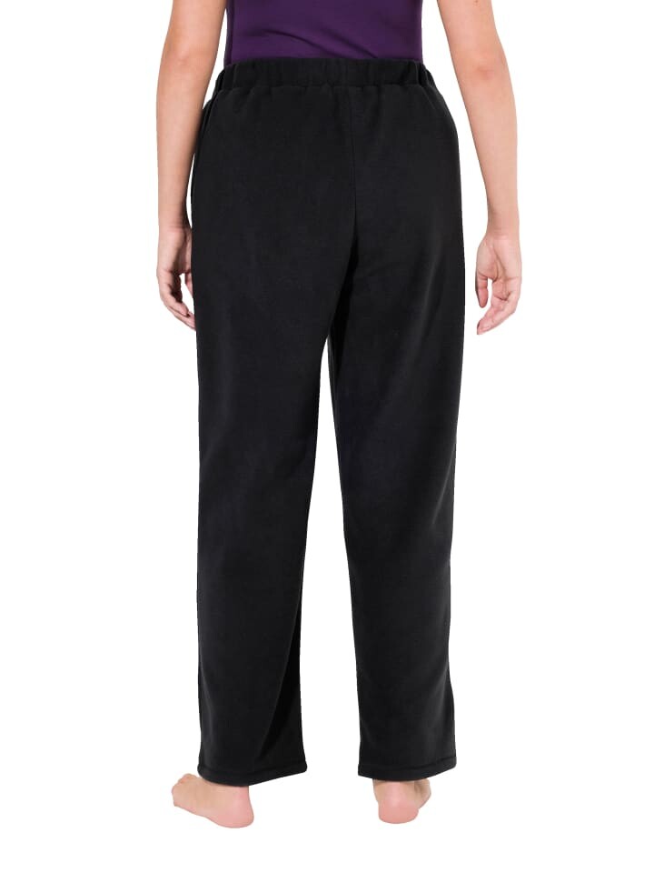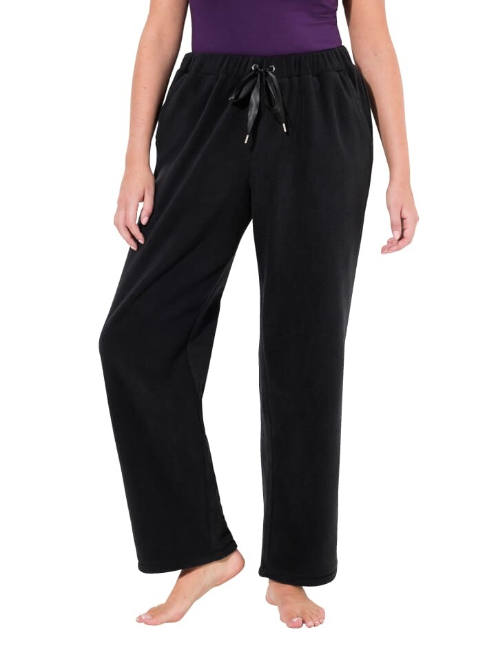 Флисовые брюки для дома, прямого кроя, с эластичным поясом и атласным завязком. Боковые карманы с мерцающей атласной окантовкой.