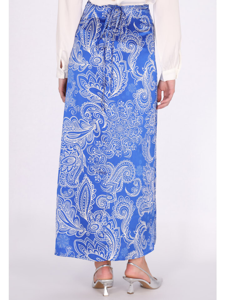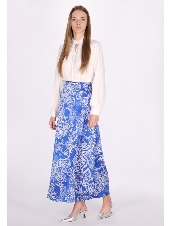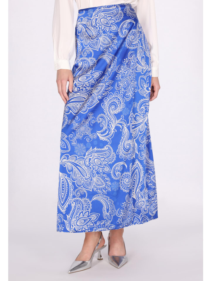 Эта юбка струящегося свободного силуэта украшена замысловатым пейсли или цветочным узором. Гладкая текстура и легкая ткань обеспечивают изящную драпировку от талии до середины икры или до щиколотки. Благодаря широкому краю и потайной застежке, создающей бесшовный вид, оно излучает элегантность и стиль.