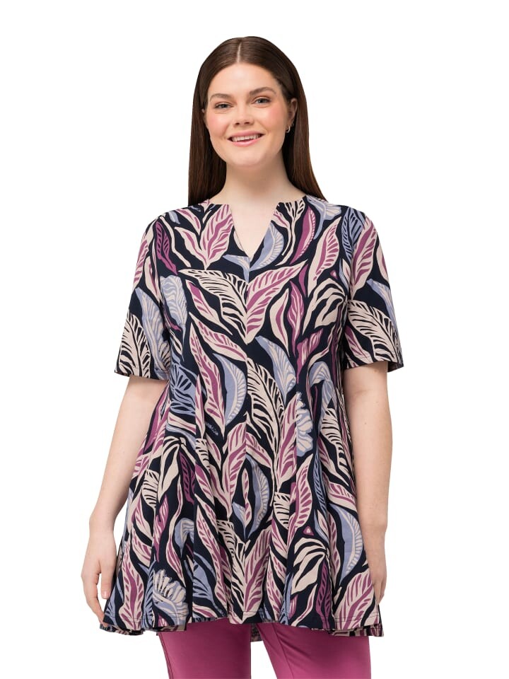 Длинная рубашка из натурального хлопка с цветным узором в виде листьев и расклешенным подолом со складками в виде годе. Вырез туники, рукава до половины. Органический; сертифицирован ECOCERT Greenlife, лицензия № 152026.