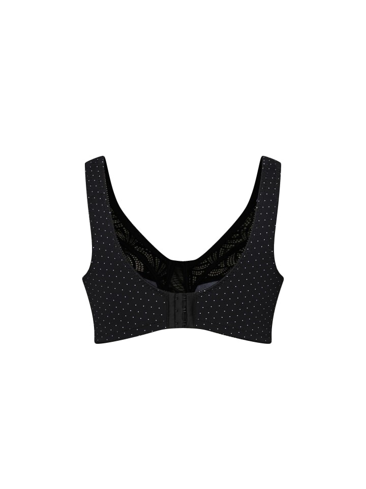 Бюстгальтер рельефный, без косточек, с горошком и кружевным краем. Приятные широкие и мягкие сетчатые бретели, регулируемые. Внешний материал: 85 % полиамид, 15 % эластан.