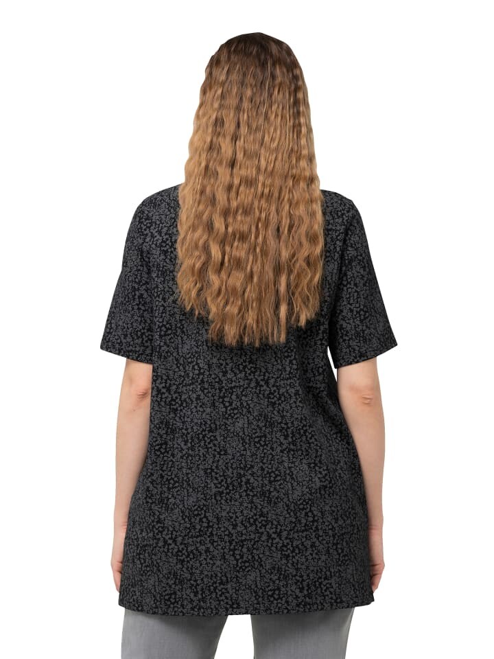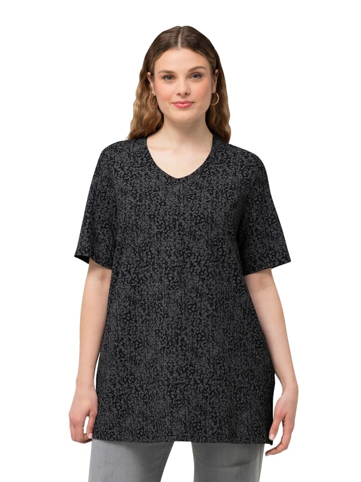 Футболка А-силуэта с мелким точечным узором. Округленный V-образный вырез, рукава до половины. Боковые разрезы для плавного падения.