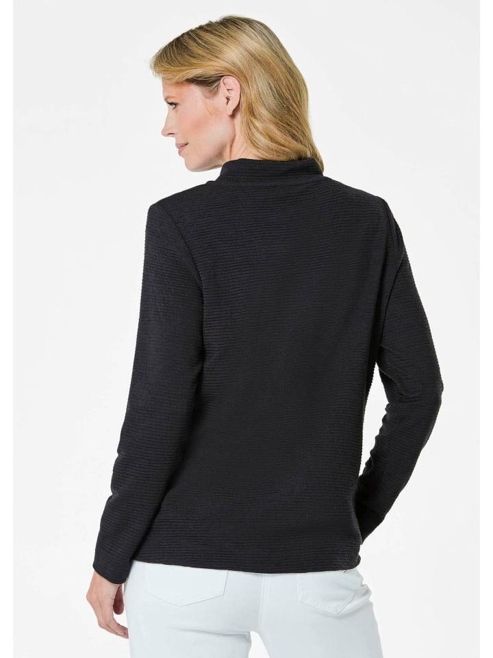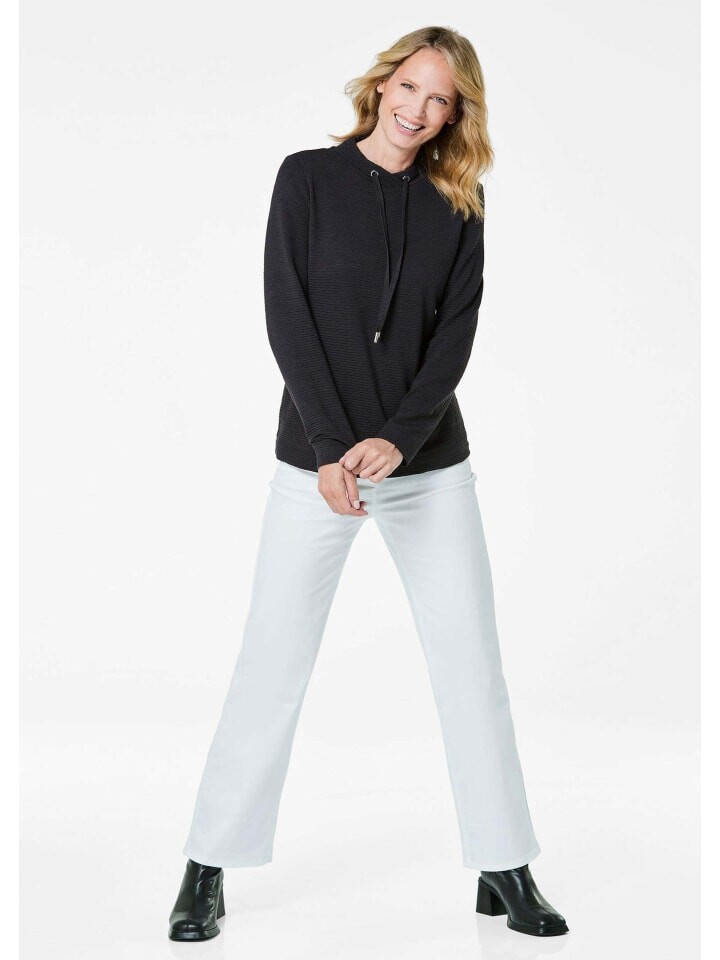 Толстовка с изысканным воротником-стойкой, заканчивающимся привлекательной буквой V спереди. Через петельки металлического цвета проходит шнур с металлическими концами, который по желанию можно завязать в бантик. Толстовка длиной до бедра имеет повседневный крой. Качество джерси с высоким содержанием вискозы и эластана придает ему мягкость и высокий уровень комфорта. Особенно привлекательной особенностью является структурированная поверхность с поперечными ребрами, которая станет стильным спутником в повседневной жизни. Длина около 66 см. 46, размер около 62 см. 23.