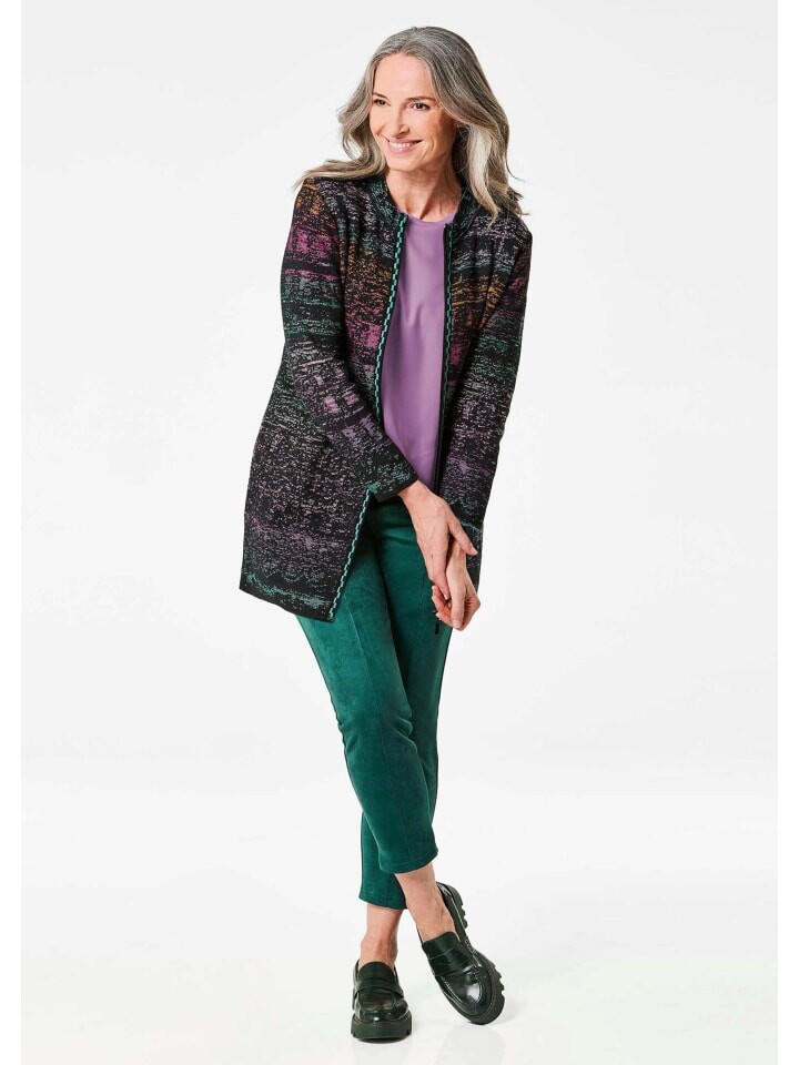 Кардиган привлекательного многоцветного дизайна. Воротник-стойка с жаккардовым узором гармонично сочетается с эффектным цветовым градиентом куртки. Застежка-молния гармонирует по тону, вставка привлекает внимание благодаря контрастному узору. Высококачественный трикотаж из легкой в уходе смеси хлопчатобумажной пряжи имеет структурированную поверхность и очень удобен в носке. Длинные рукава заканчиваются трубчатым краем. Особенно подчеркивает фигуру: длина, закрывающая бедра, вытягивает силуэт. В куртке нет карманов, поэтому ничего громоздкого. Длина около 76 см по размеру. 46, размер около 72 см. 23.