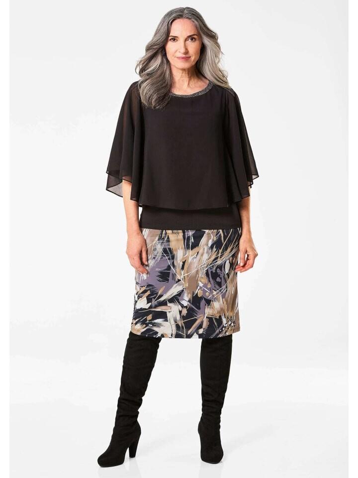 Блузка-рубашка из мягкого шифона. Широкие рукава длиной до локтя элегантно раскачиваются при каждом движении. Трикотажная вставка делает рубашку непрозрачной и удобной в носке. Женственный вырез-лодочка украшен сверкающими камнями и придает элегантный блеск. Облегающий фигуру крой. Для съемки сзади на пуговице и петле. Длина около 64 см. 46, размер около 60 см. 23.