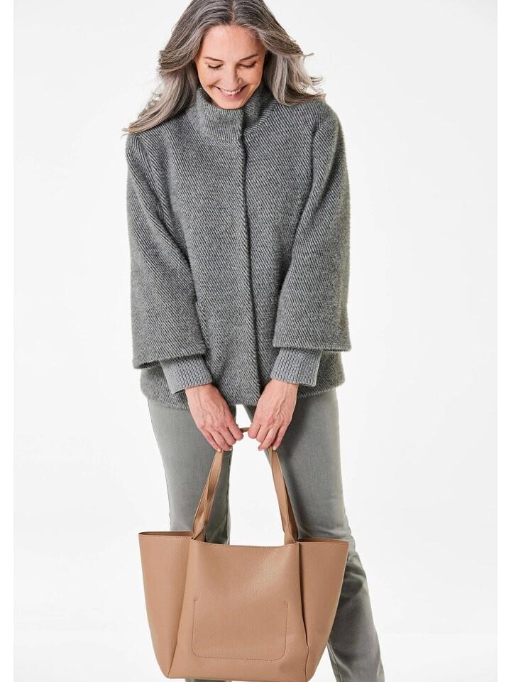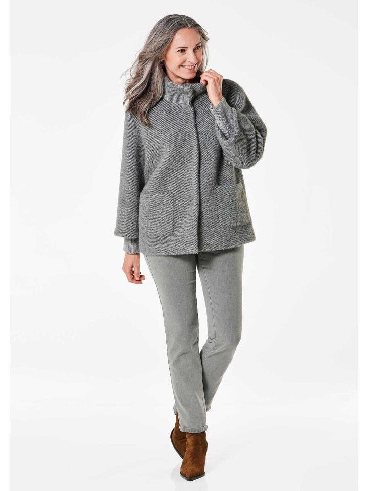 Куртка из ворсистого, пушистого материала. Гармоничный узор тон в тон в саржевой структуре и укороченный крой А-силуэта создают стильный образ. Утепленный воротник-стойку можно носить и как отложной воротник. Рукава с трикотажными манжетами и заниженной линией плеча. С двумя накладными карманами и двумя внутренними карманами на подкладке. Высококачественные кнопки в виде рога и элегантная блестящая подкладка. Длина около 71 см. 46, размер около 67 см. 23.