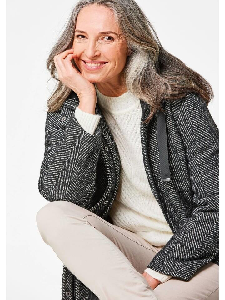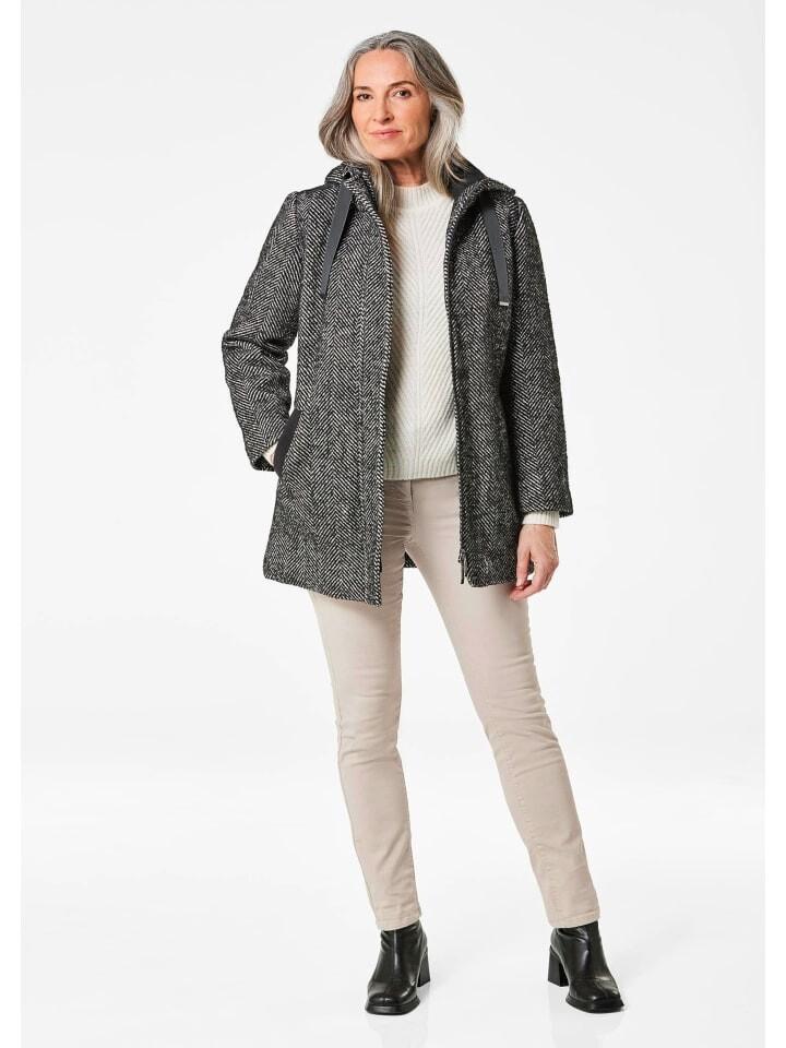 Короткое пальто с привлекательным узором «елочка», которое поможет вам в холодное время года. Благодаря высокому содержанию шерсти и тщательно продуманной стеганой подкладке из переработанного материала пальто сохраняет тепло и тепло. Двусторонняя молния прикрыта планкой на кнопках, воротник-стойка с уютной трикотажной вставкой и капюшон обеспечивают защиту в непогоду. Благодаря красивым репсовым лентам капюшон можно регулировать. С двумя практичными боковыми карманами и двумя внутренними карманами на подкладке. Длина около 83 см по размеру. 46, размер около 79 см. 23.