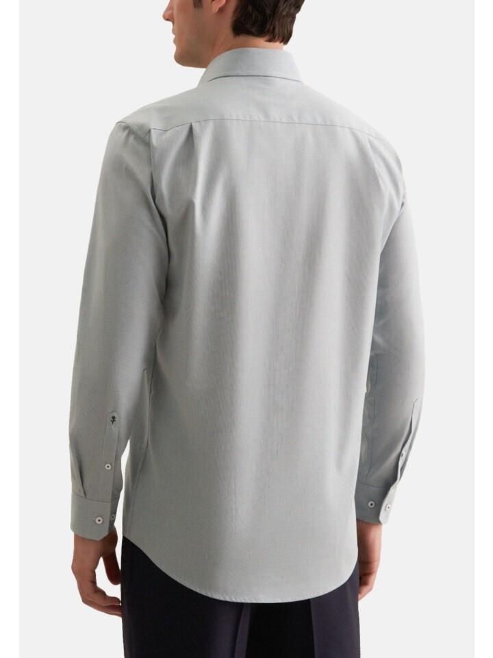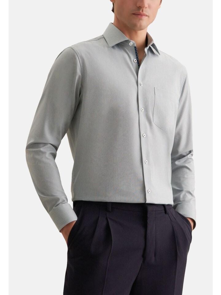 Откройте для себя идеальное сочетание элегантности и функциональности в этой мужской рубашке с длинными рукавами обычного кроя. Классический воротник Kent и планка на пуговицах во всю длину придадут вашему образу неподвластную времени изысканность. Регулируемые манжеты с двумя пуговицами обеспечивают гибкую регулировку для оптимального комфорта. Практичный нагрудный карман обеспечивает дополнительную функциональность без ущерба для стиля. Узкая полоска с узором на воротнике добавляет тонкий модный акцент. Тонкая вышивка над манжетом придает рубашке нотку эксклюзивности. Благодаря нежелезным свойствам за ним особенно легко ухаживать, и он всегда готов к следующему использованию. Высококачественные материалы гарантируют максимальный комфорт в течение всего дня. Идеально подходит для офиса и отдыха, его можно комбинировать разными способами, и он всегда остается стильным. Наслаждайтесь модой, сочетающей в себе комфорт, элегантность и практичность.