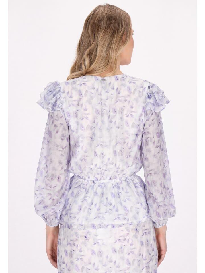 Поддайтесь очарованию этой изысканной блузки с очаровательным цветочным узором. V-образный вырез и изящные рюши на плечах излучают женственность. Длинные рукава и эластичные манжеты создают легкий эффект пышности и создают шикарный силуэт благодаря индивидуальному крою. Эту элегантную модель, выполненную из легкой, струящейся ткани, можно легко носить как в повседневных, так и в полуофициальных случаях.