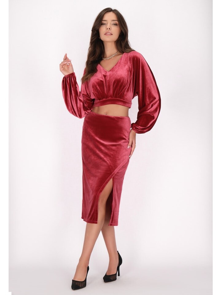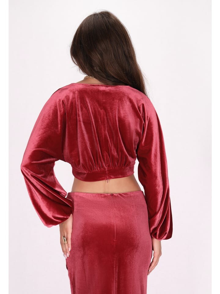 Украсьте свой вечерний образ этой элегантной укороченной бархатной блузкой. Эта блузка с глубоким V-образным вырезом и длинными рукавами-колокольчиками излучает изысканность. Зауженная талия и укороченный подол создают эффект развеваемости. Эта бархатная блузка со светоотражающим блеском, идеально подходящая для вечернего выхода, обязательно привлечет внимание. Этот продукт является частью коллекции Velvet