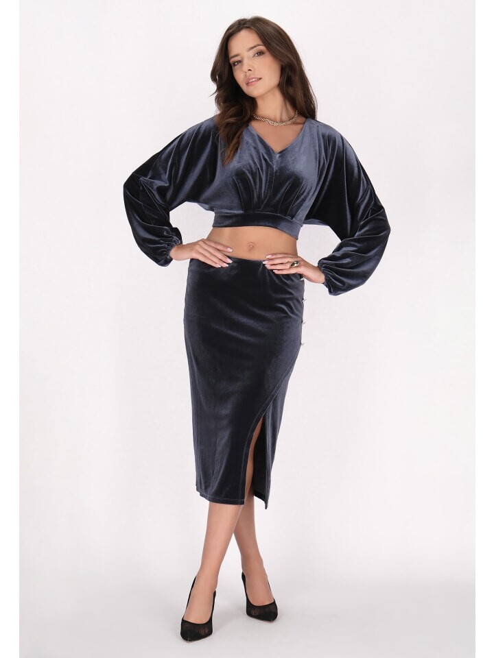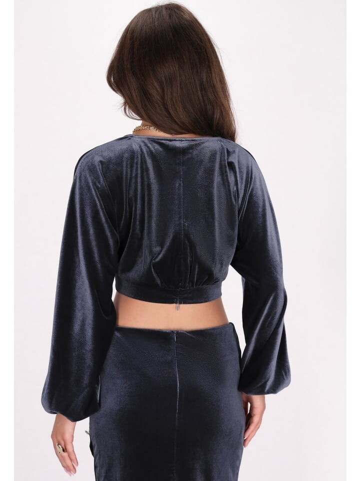 Украсьте свой вечерний образ этой элегантной укороченной бархатной блузкой. Эта блузка с глубоким V-образным вырезом и длинными рукавами-колокольчиками излучает изысканность. Зауженная талия и укороченный подол создают эффект развеваемости. Эта бархатная блузка со светоотражающим блеском, идеально подходящая для вечернего выхода, обязательно привлечет внимание. Этот продукт является частью коллекции Velvet