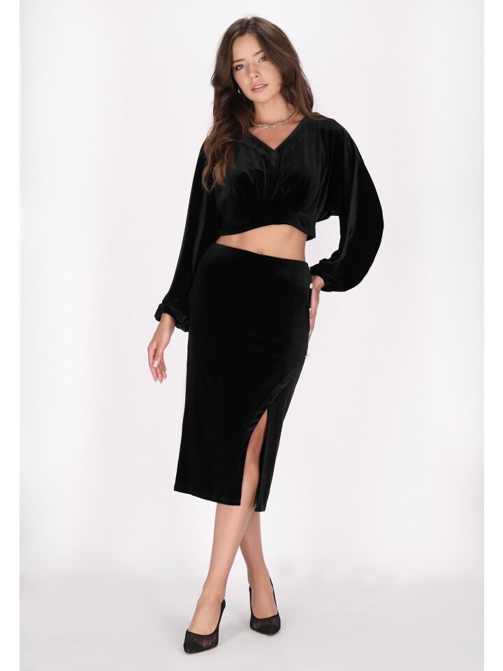 Эта элегантная юбка-карандаш миди незаменима в вашем гардеробе на выход. Эта бархатная юбка с высокой талией и приталенным силуэтом излучает изысканность. Разрез с одной стороны добавляет очарования, а декоративное кружево подчеркивает привлекательность. Эта стильная юбка идеально подойдет как для вечеринки, так и для работы. Она идеально подчеркнет ваш образ. Этот продукт является частью коллекции Velvet