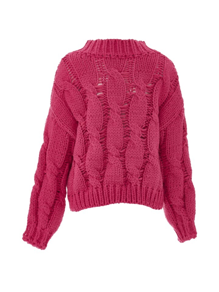 Этот вязаный свитер имеет объемную текстуру с замысловатыми узорами из кос, образующими рельефный плетеный узор. Ребристый V-образный вырез и манжеты, а также намеренно потертые детали, такие как отверстия и потертые нити, создают винтажный образ. Эта модель, созданная в качестве верхней одежды, обеспечивает тепло благодаря плотной трикотажной конструкции и плотному прилеганию к талии.