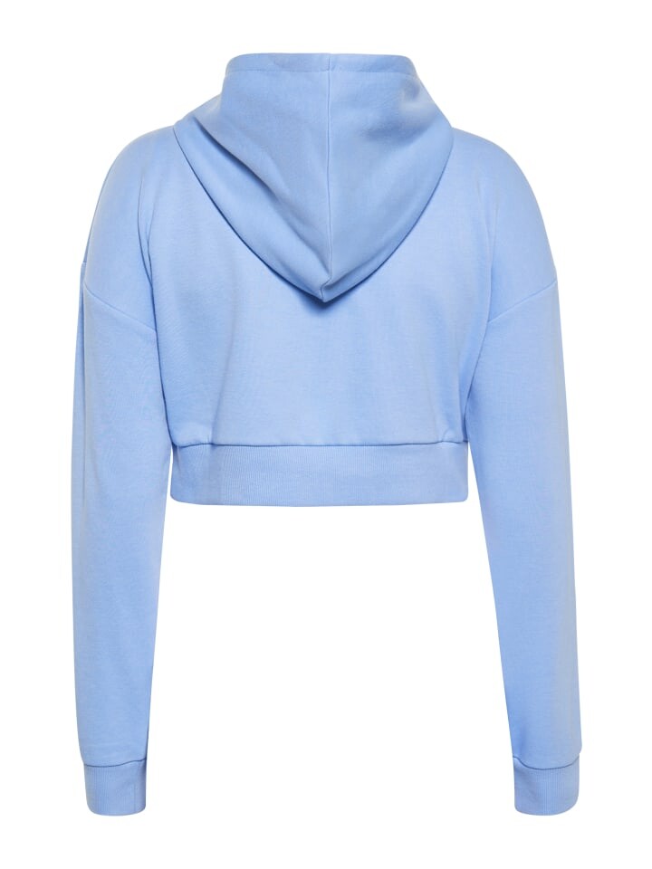 Укороченная женская толстовка с длинными рукавами и капюшоном. Передняя часть толстовки украшена блестящей надписью. Тонкая кулиска на талии. Блуза прекрасно сочетается с брюками с завышенной талией. Рекомендуется для повседневной носки.