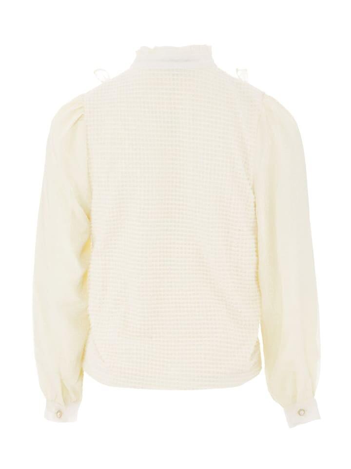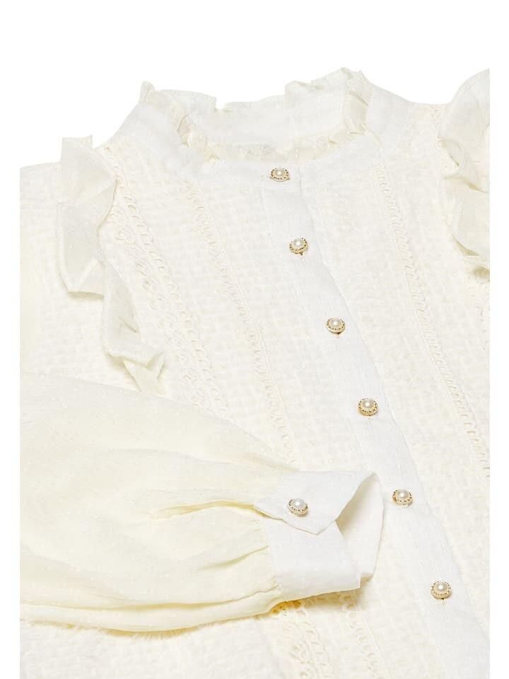 Пополните свой гардероб этой изысканной блузкой с длинными рукавами, высоким воротником и изящными деталями с рюшами. Текстурированный узор украшен вертикальными кружевными украшениями, которые излучают женственный винтажный шарм. Эластичные манжеты создают эффект складок, придавая изысканности, а планка на пуговицах спереди придает элегантность этому вневременному изделию.