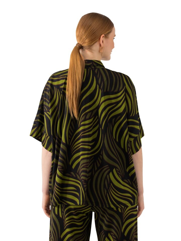 Облегающая блузка оверсайз из элегантного облегающего джерси пике с тонкой структурой и узором в виде пальмовых листьев размера XL. Рубашечный воротник, заниженная линия плеча, планка на пуговицах. Широкие полурукава, закругленный низ и удлиненная спинка.