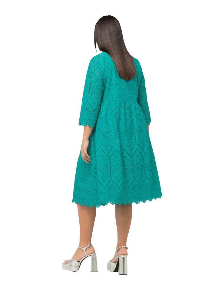 Платье миди А-силуэта с тонким кружевом. Вырез-туника, расклешенный низ, рукава 3/4. Нижнее белье из непрозрачного трикотажа, без рукавов. Внешний материал: 100 % хлопок. Подкладка: 100 % хлопок.