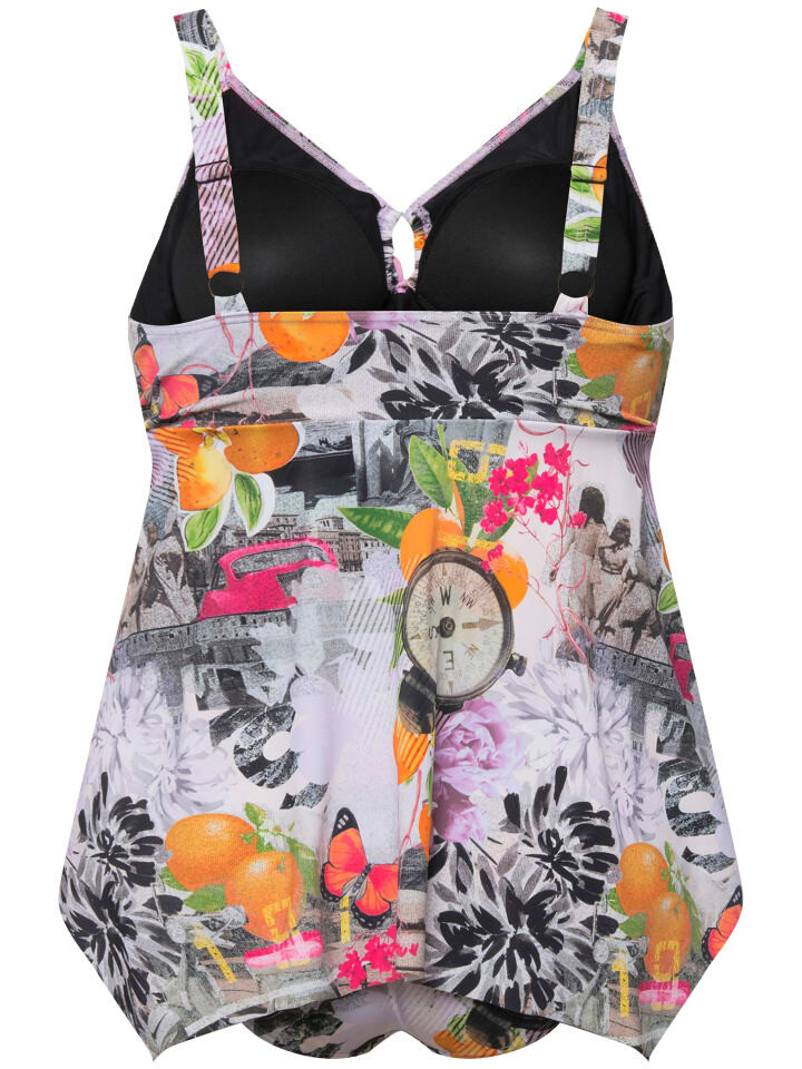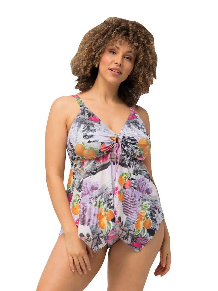 Танкини, костюм-двойка с нашивкой в виде часов и подолом в виде носового платка. Удлиненный топ с небольшим вырезом и бретелькой между мягкими чашками. Регулируемые бретели, поддерживающая лента под грудью, полностью на подкладке. Соответствующие трусы. OEKO-TEX.