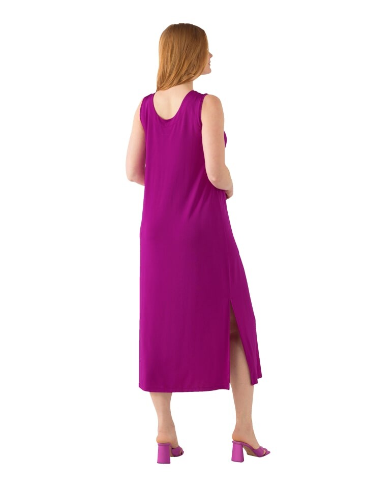 Облегающее платье миди А-силуэта без рукавов. V-образный вырез с качественной облицовочной обработкой, длинные боковые разрезы для еще большей свободы движений.