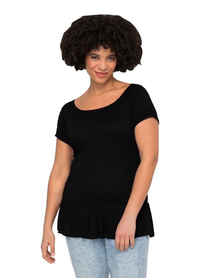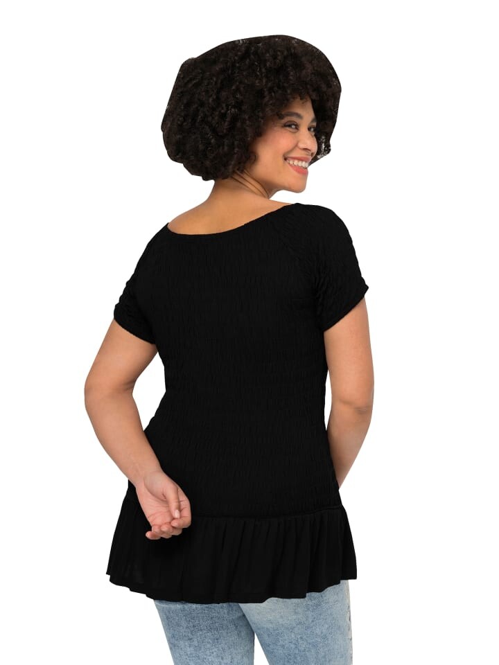 Топ приталенного кроя из эластичного присборенного трикотажа с широким круглым вырезом и рукавами до половины. Волан по низу.