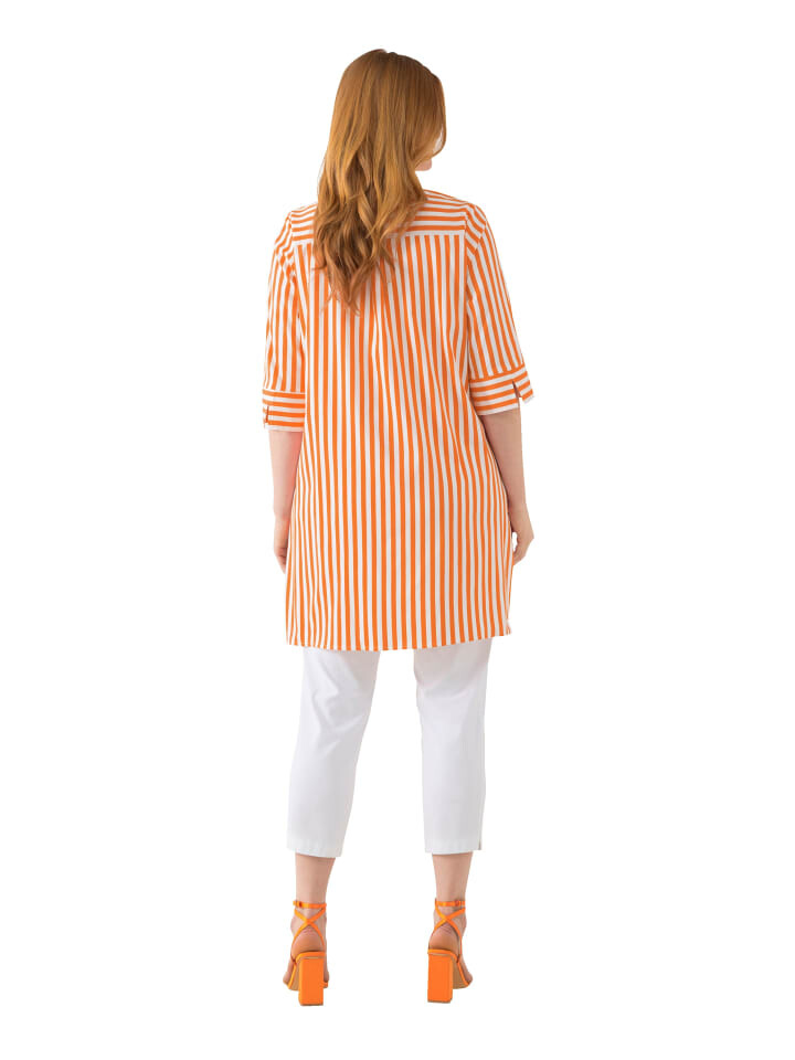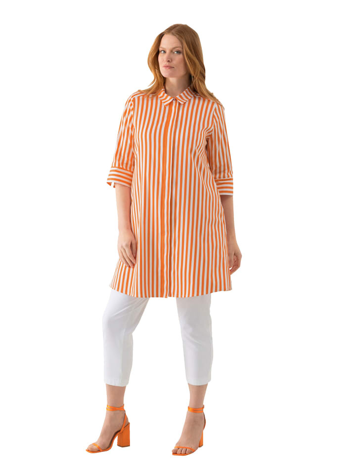 Длинная блузка А-силуэта с полосками и длинными разрезами по бокам для плавного падения. Воротник рубашки, планка на потайных пуговицах, карманы в боковых швах. Рукава 3/4 с манжетами.