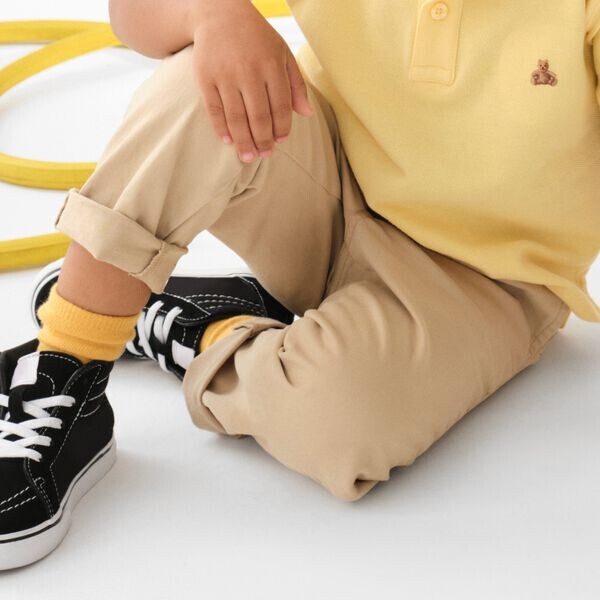 Брюки из эластичного хлопка. Эластичный пояс с кулиской. Два косых кармана и один прорезной карман спереди.