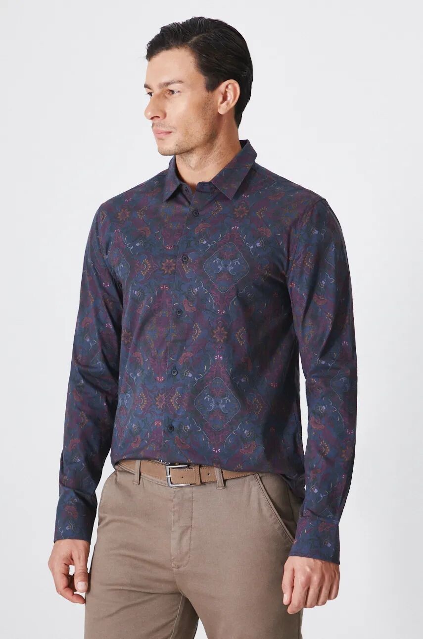 Медицинская рубашка. Изготовлен из узорчатой ​​ткани. Модель оснащена классическим воротником с мягкой подкладкой.