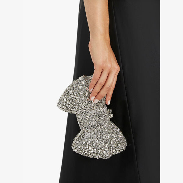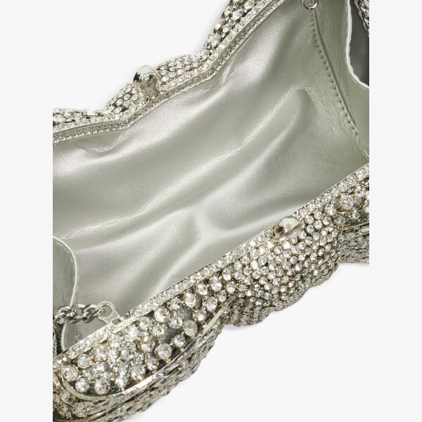 Силуэт в виде банта, сплошная отделка стразами, ремешок-цепочка, серебристая фурнитура, одно основное отделение