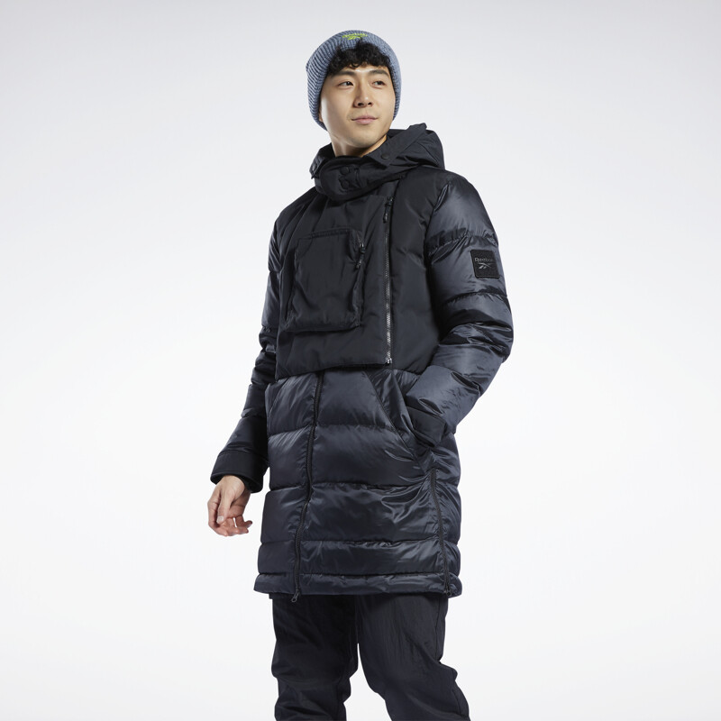 Теплая куртка средней длины имеет капюшон и предназначена для носки в холодный период.