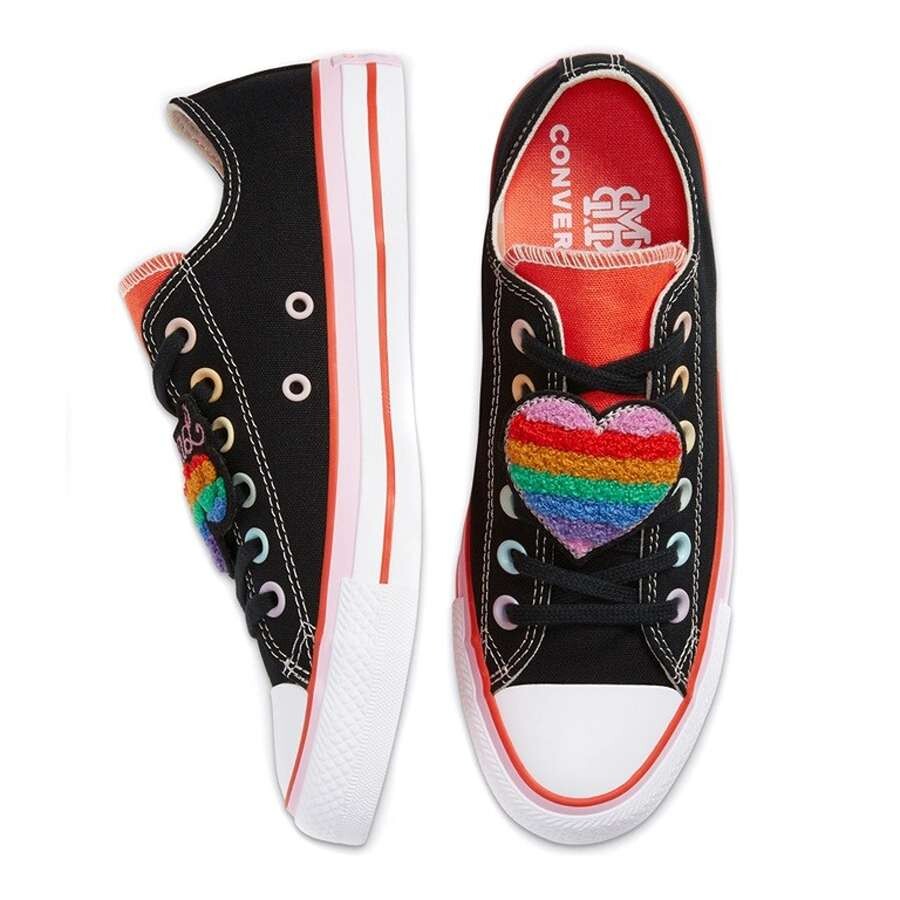 Converse и Милли Бобби Браун представляют вторую совместную коллекцию. Кеды выполнены с черным холщовым верхом, разноцветными люверсами и двухцветной лентой. Сменные радужные нашивки украшают шнурки. Вулканизированная резиновая подошва украшена смелой боковой полосой и трехцветным логотипом на пятке.