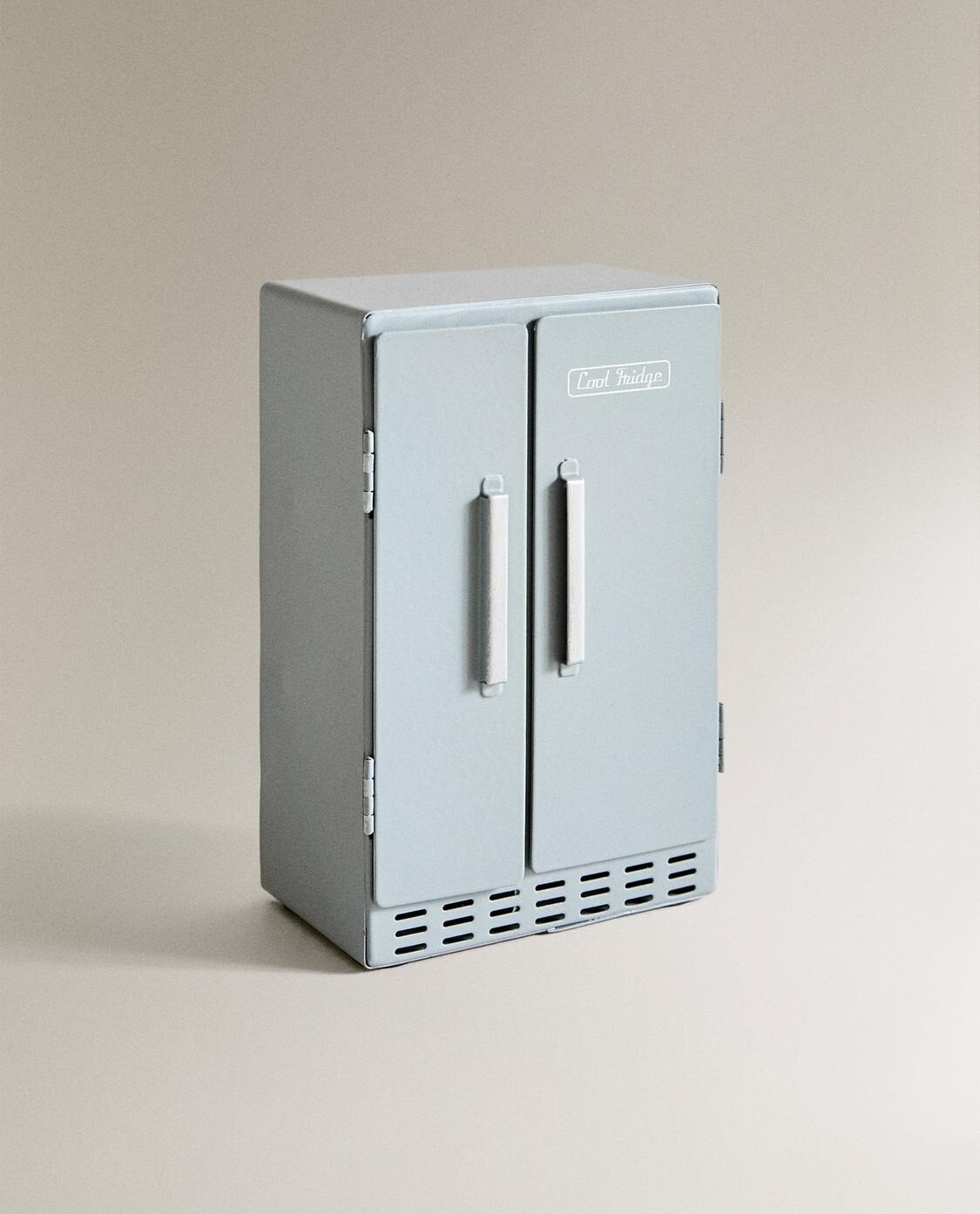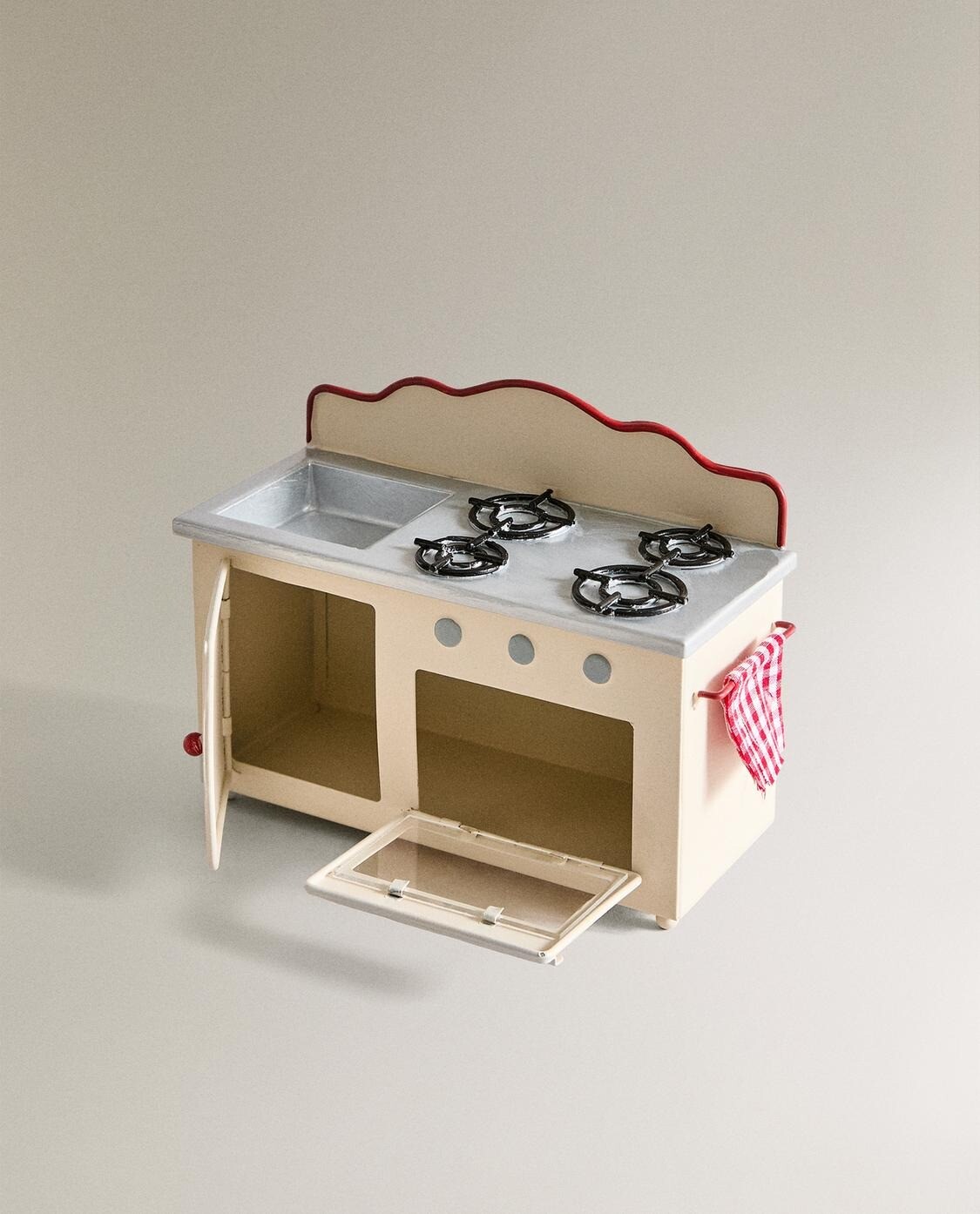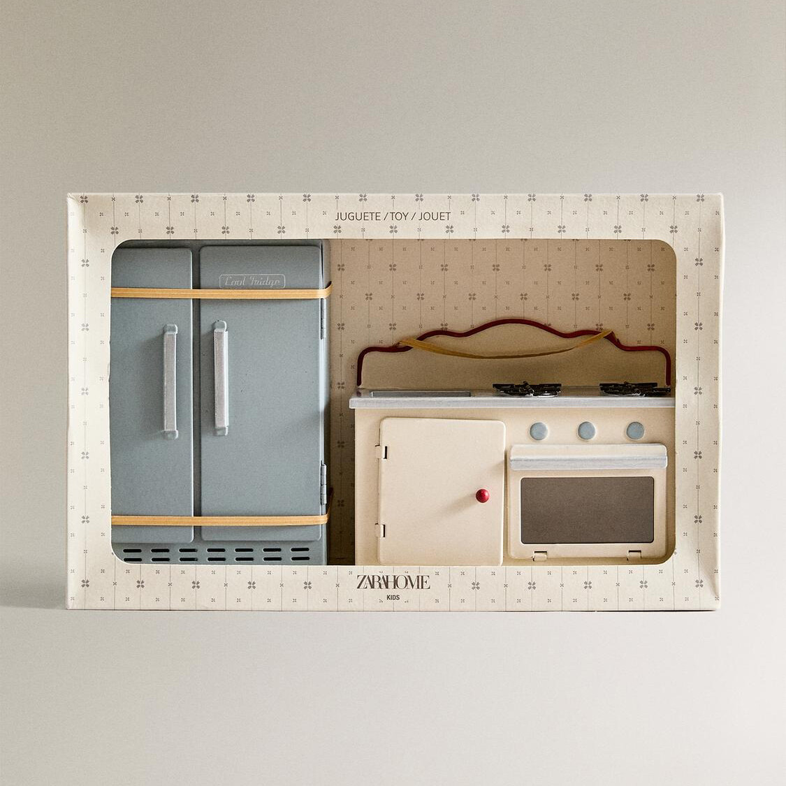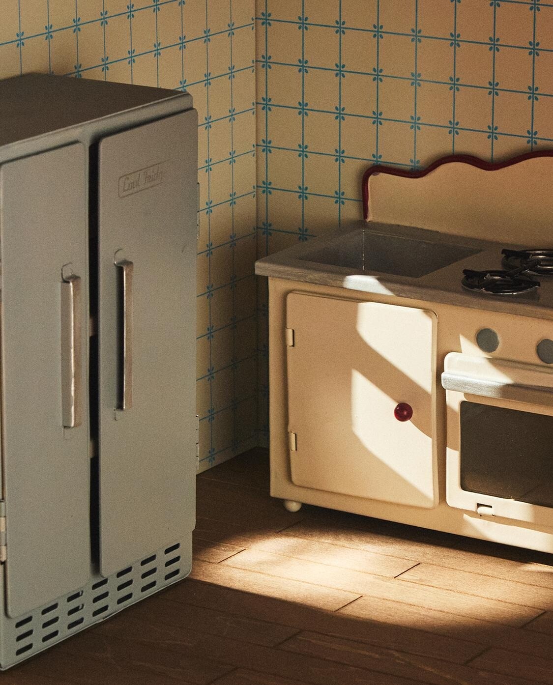 Детский игрушечный набор аксессуаров, состоящий из миниатюрной мебели для кухни кукольного домика. В набор входит столешница со встроенной плитой и духовкой, а также двухдверный холодильник.