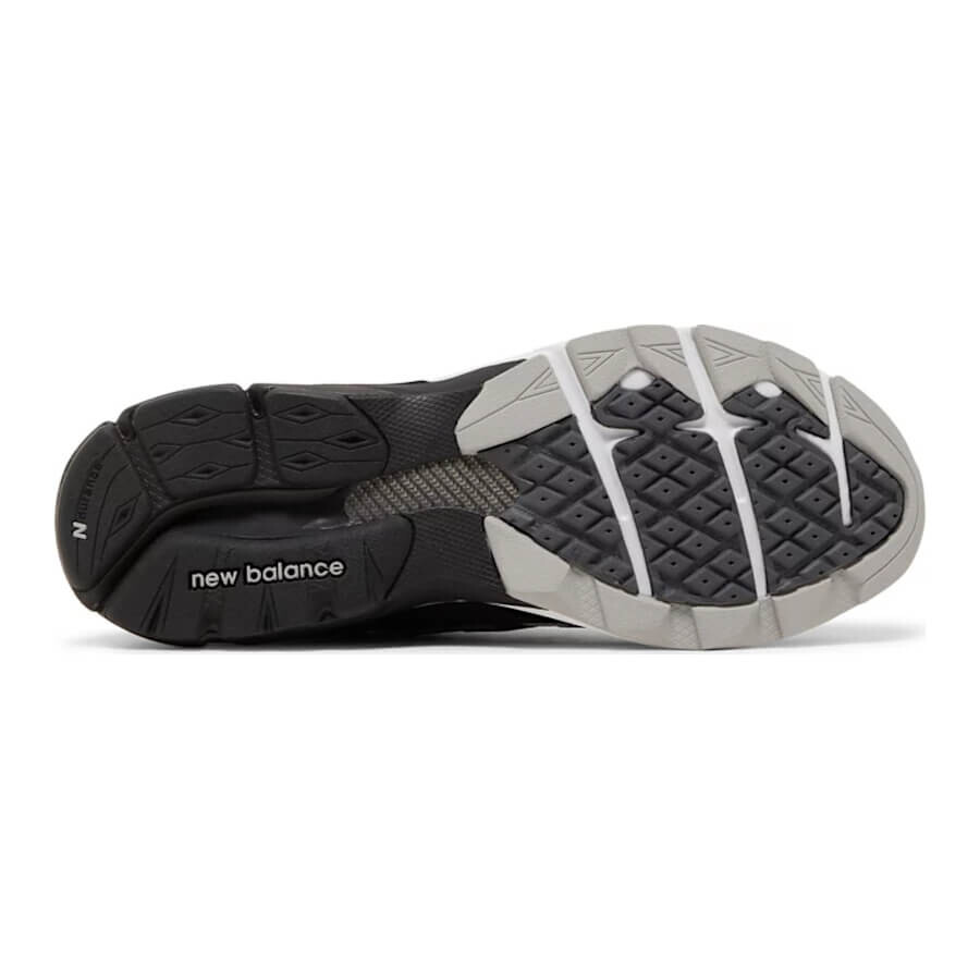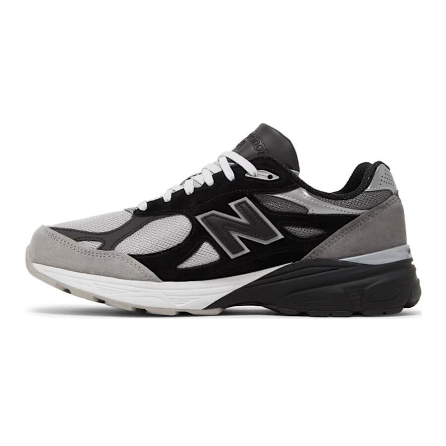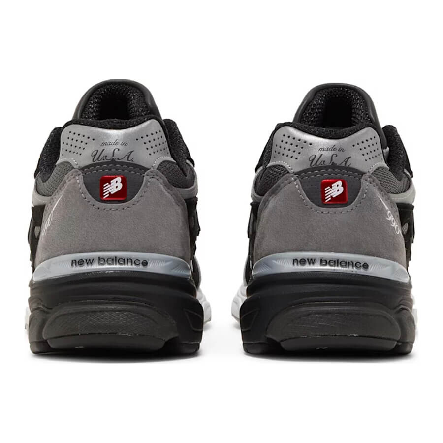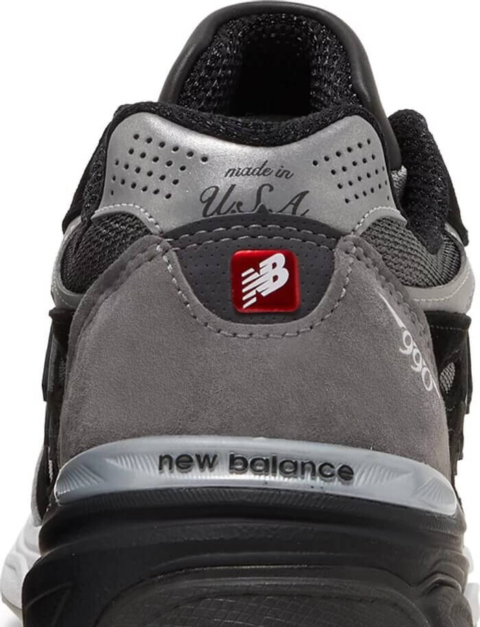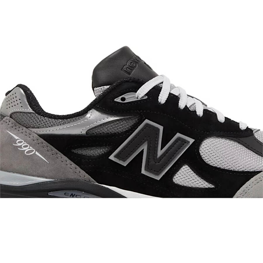 Кроссовки выполнены в черно-серой цветовой гамме и имеют верх из материала Base с накладками из кожи и замши. Серая замша использована на носочной части и пятке, а черная кожа - на средней панели и язычке. Светоотражающие серебристые детали выделяют воротник и выступ на пятке. Фирменные детали включают тональные логотипы 'N', вышивку '990' на боковой стороне пятки, фирменный логотип 'NB' на пятке и фирменный язычок. Промежуточная подошва ENCAP и резиновая подошва завершают дизайн.