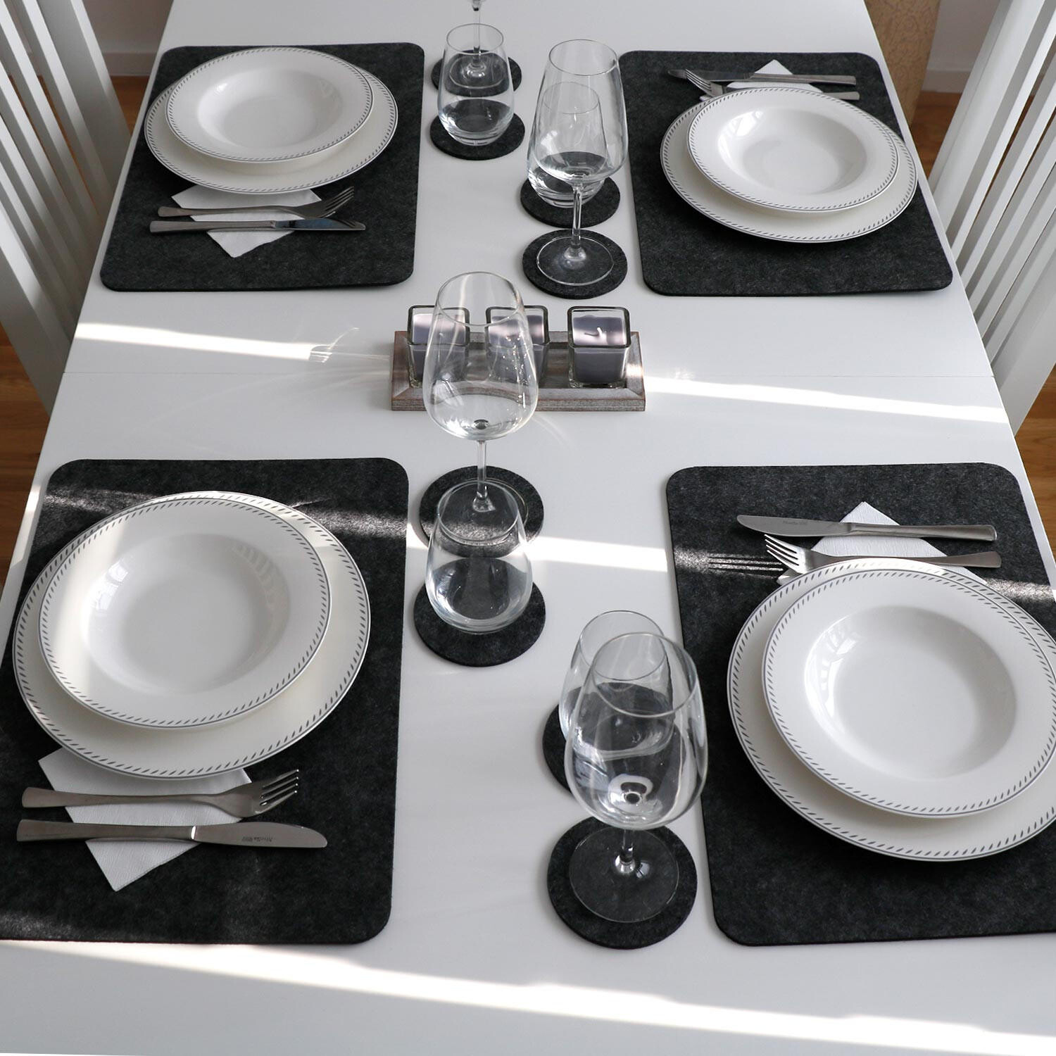 Особенности: ЭЛЕГАНТНЫЙ С КРУГЛЫМ УГЛОМ - Благодаря бархатисто-мягкой поверхности элегантного серого цвета коврики для столовых приборов трансформируются. ваш стол в современную и стильную доску Blackboard. Стеклянная столешница и деревянный стол, круглый или квадратный: толстые фетровые салфетки украсят любой обеденный стол