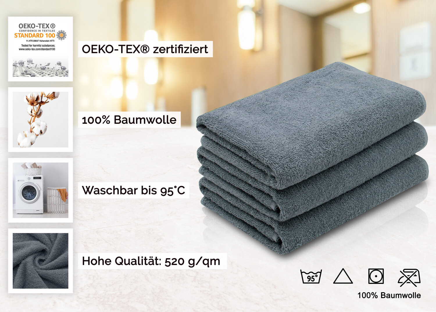 Инструкции по уходу: Машинная стирка при температуре до 95°C, Не гладить, Разрешено любое отбеливание, Можно сушить в барабане