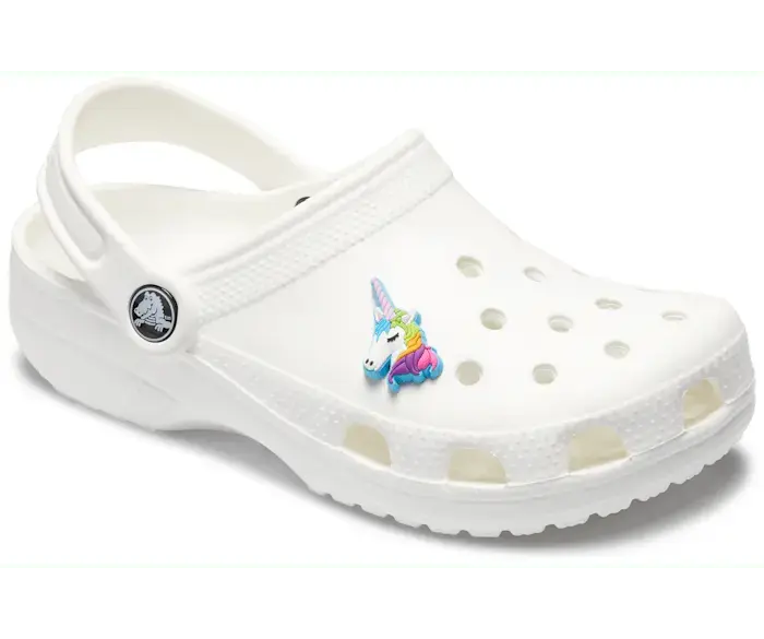 Этот белый брелок Unicorn Jibbitz с радужной гривой и фиолетовым рогом покажет миру, что вы волшебный и веселый человек.