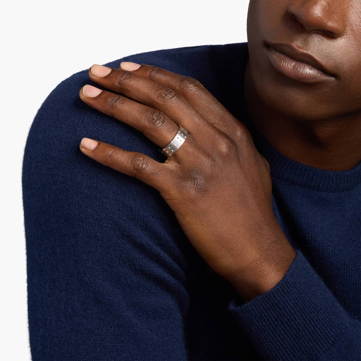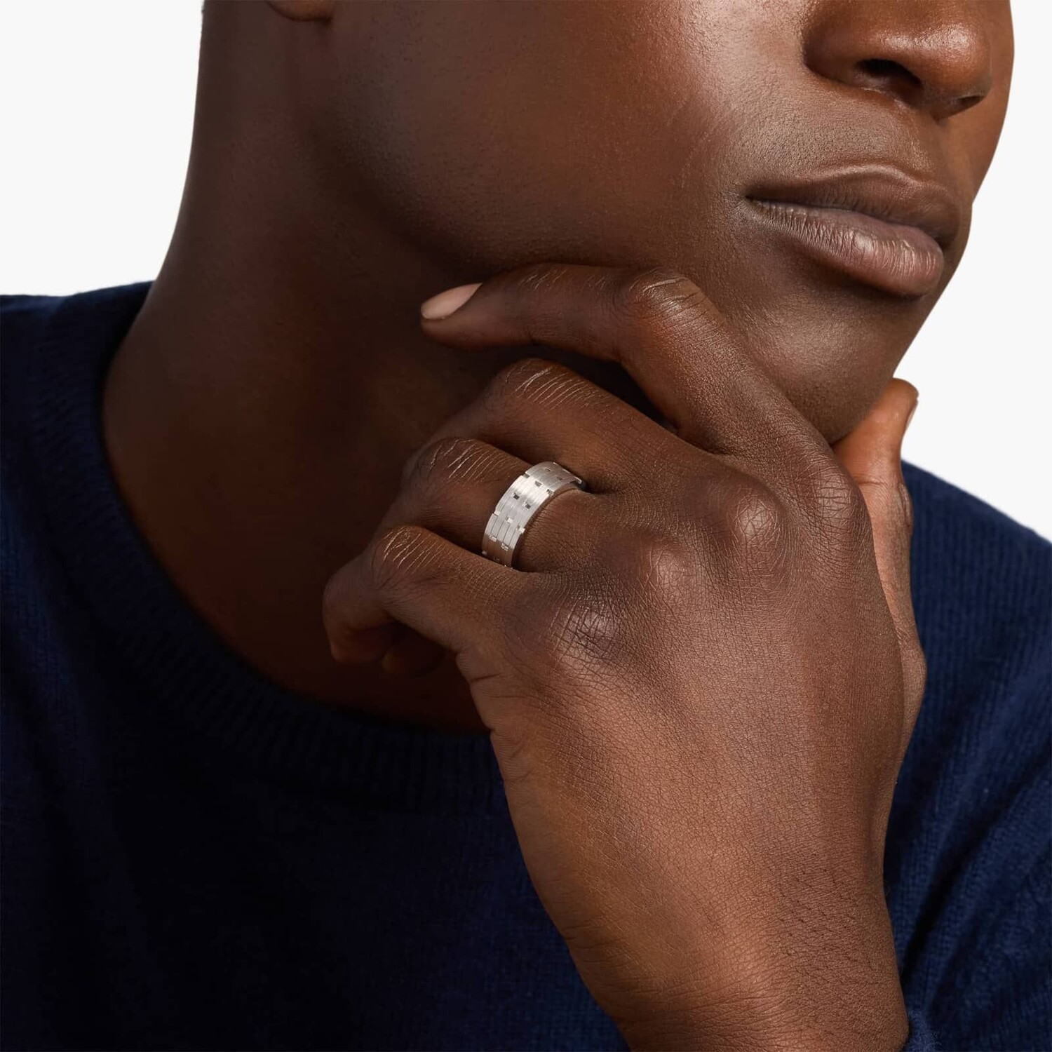 Это уникальное современное обручальное кольцо с гладким дизайном и геометрическими соединительными звеньями обещает изысканный вид. Оно изготовлено из платины с роскошной матовой отделкой.