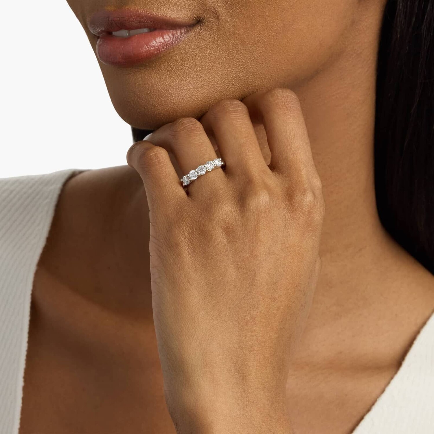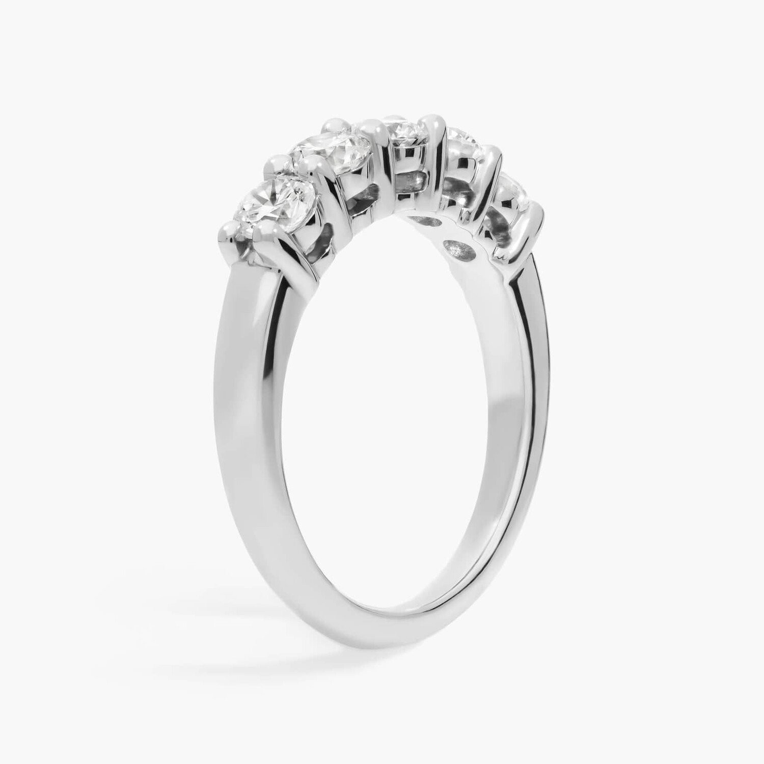Кольцо Eternal с пятью камнями и бриллиантами — это именно то, что нужно, вневременной дизайн, символизирующий вечную любовь. Пять круглых бриллиантов огранки общим весом около 1 карата надежно закреплены в общих зубцах, охватывающих около 3/4 дюйма по всей верхней части кольца. Этот прочный стиль платинового кольца с пятью камнями — невероятно удобная и необходимая вещь.