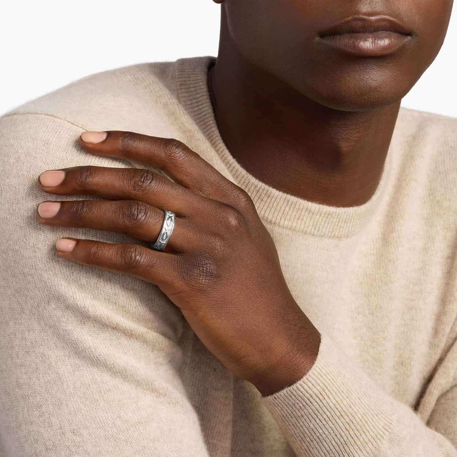 Объедините веру и любовь с этим элегантным обручальным кольцом, украшенным бесконечным узором Ихтиса, окружающим его. Блестящий платиновый дизайн обещает непреходящее качество и роскошь.