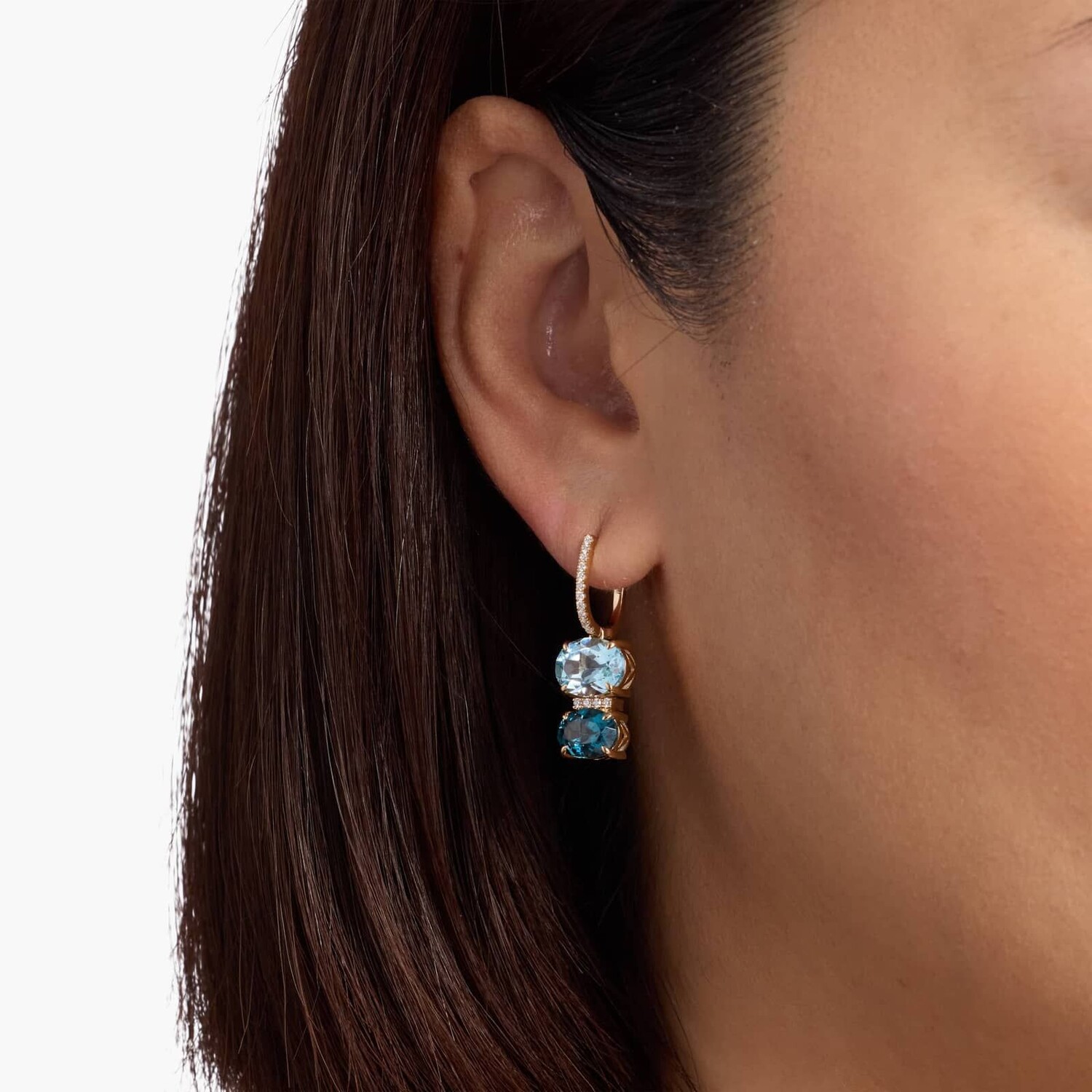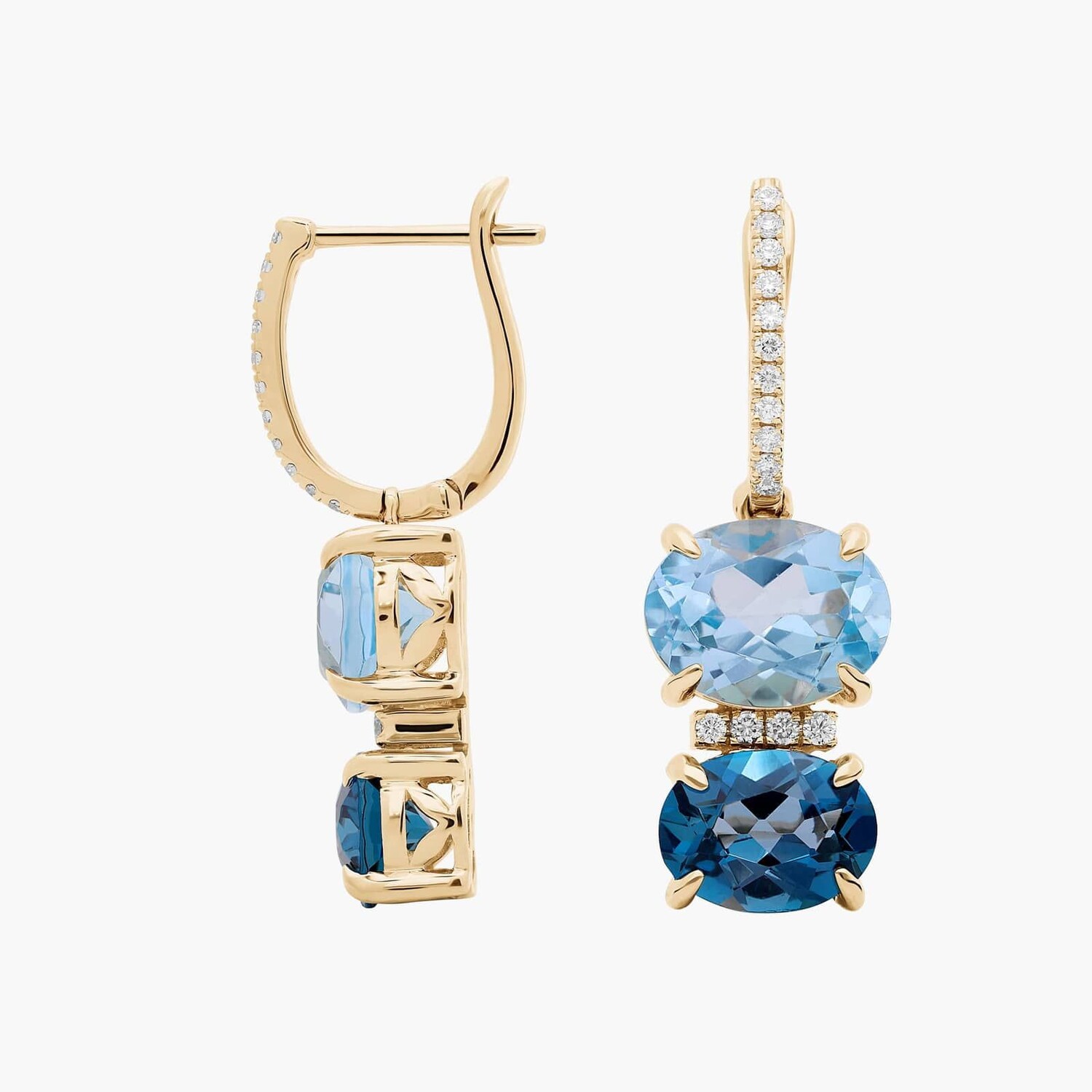 Наслаждайтесь синими оттенками, когда надеваете эти великолепные серьги-подвески, каждая из которых украшена овальным топазом London blue и небесно-голубым топазом. Прохладные тона камней прекрасно дополняются теплым блеском дизайна из 14-каратного желтого золота.