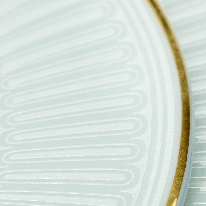 Дизайн в стиле ар-деко, отделка из 20-каратного настоящего золота, матовые рельефные детали, глазурованная технология позволяет мыть в посудомоечной машине