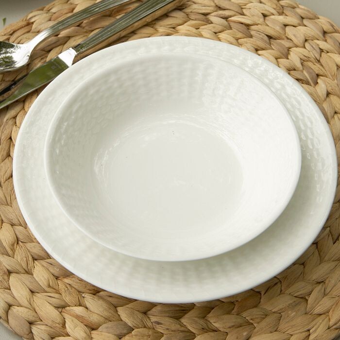 Этот эклектичный сервиз с прекрасно детализированным рельефом в виде корзины — «повседневный» белый фарфор для тех, кто ценит уникальность. Костяной фарфор.