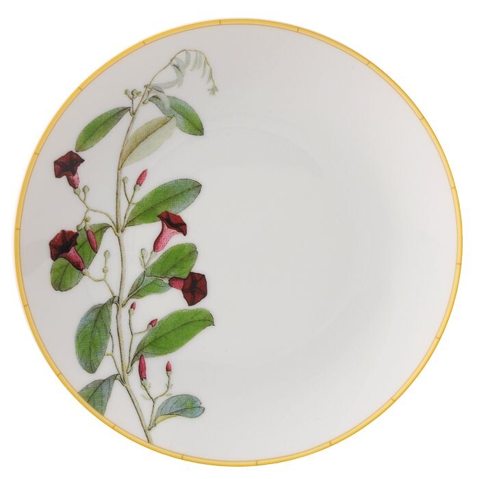 Эта прекрасная фарфоровая тарелка от Bernardaud украшена тщательно детализированными цветочными и растительными иллюстрациями, созданными на основе ботанических рисунков садов Мумбаи, Индия, где растет множество редких видов растений. Его окантовка украшена узором «тромплёй» из ротанга, напоминающим популярные дизайны индийской мебели.