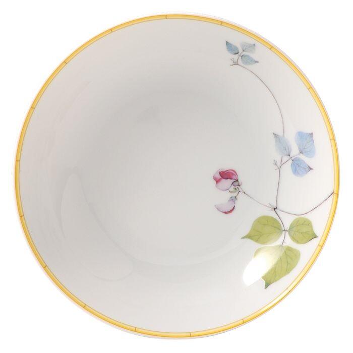 Эту прекрасную фарфоровую чашу от Bernardaud украшают точные цветочные и растительные иллюстрации, созданные на основе ботанических рисунков садов Мумбаи, Индия, где растет множество редких видов растений. Его окантовка украшена узором «тромплёй» из ротанга, напоминающим популярные дизайны индийской мебели.