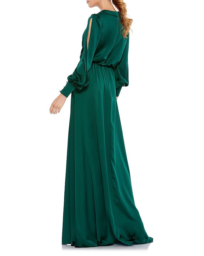 Атласная ткань , Объемные разрезные рукава с удлиненными манжетами, Затянутая талия, Разрез до бедра.