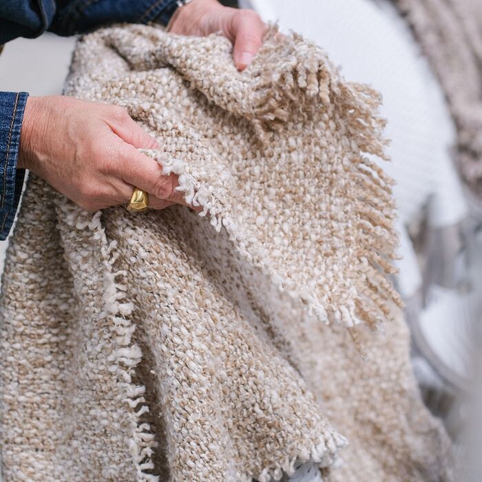 Выткане вручную из контрастной пряжи, создающей эффект рыхлости.