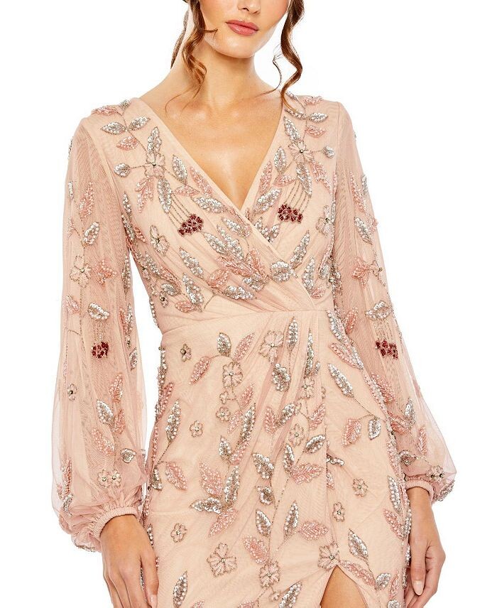 Цветочные украшения по всей поверхности; высокий разрез; длинные рукава-фонарики