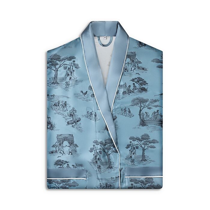 Изготовлено из лучших материалов. В этом халате из чистого шелковистого шелка с гордостью представлен очаровательный принт Harlem Toile de Jouy синего оттенка, подчеркнутый контрастной окантовкой цвета слоновой кости, придающей современный вид.